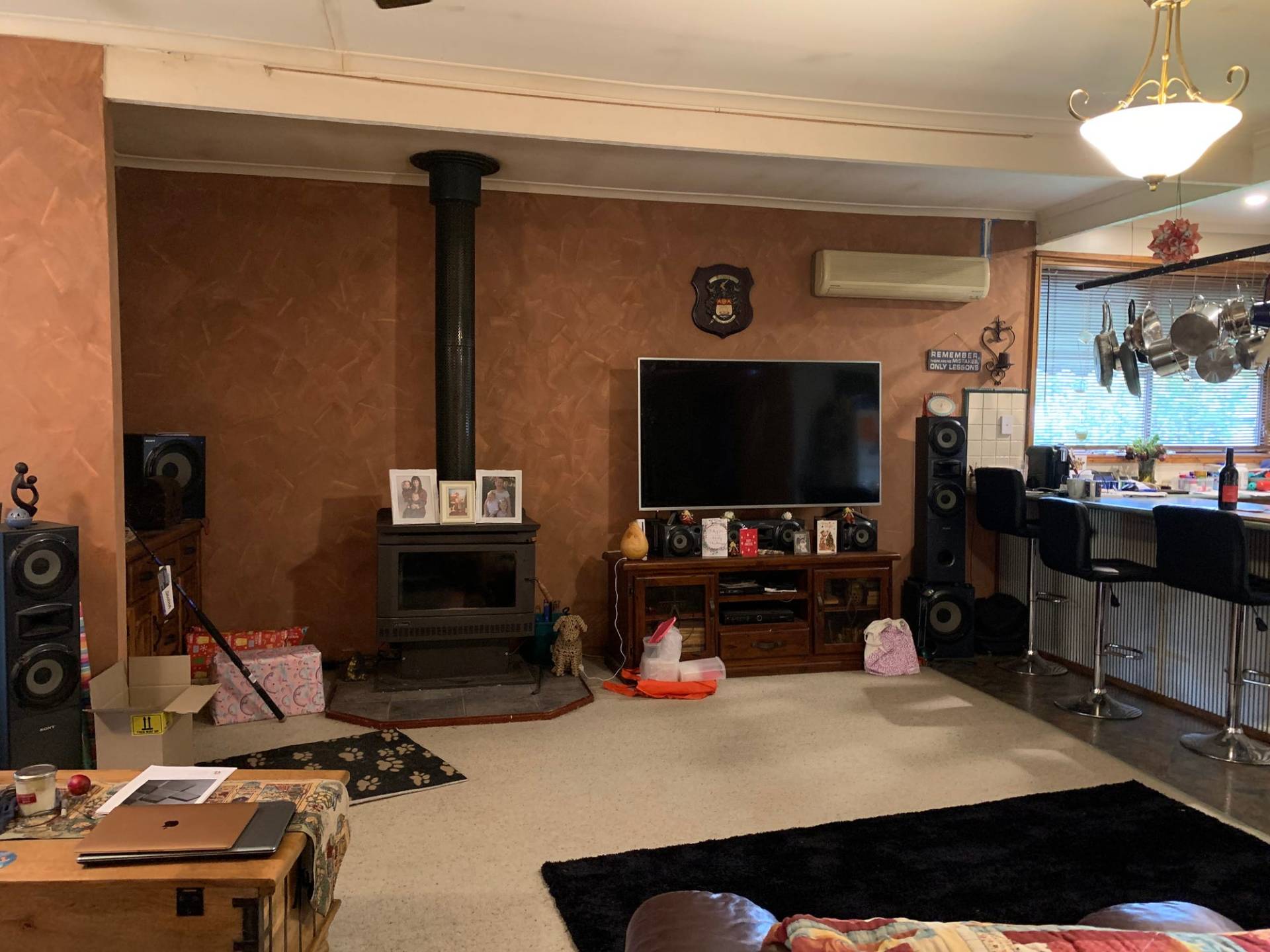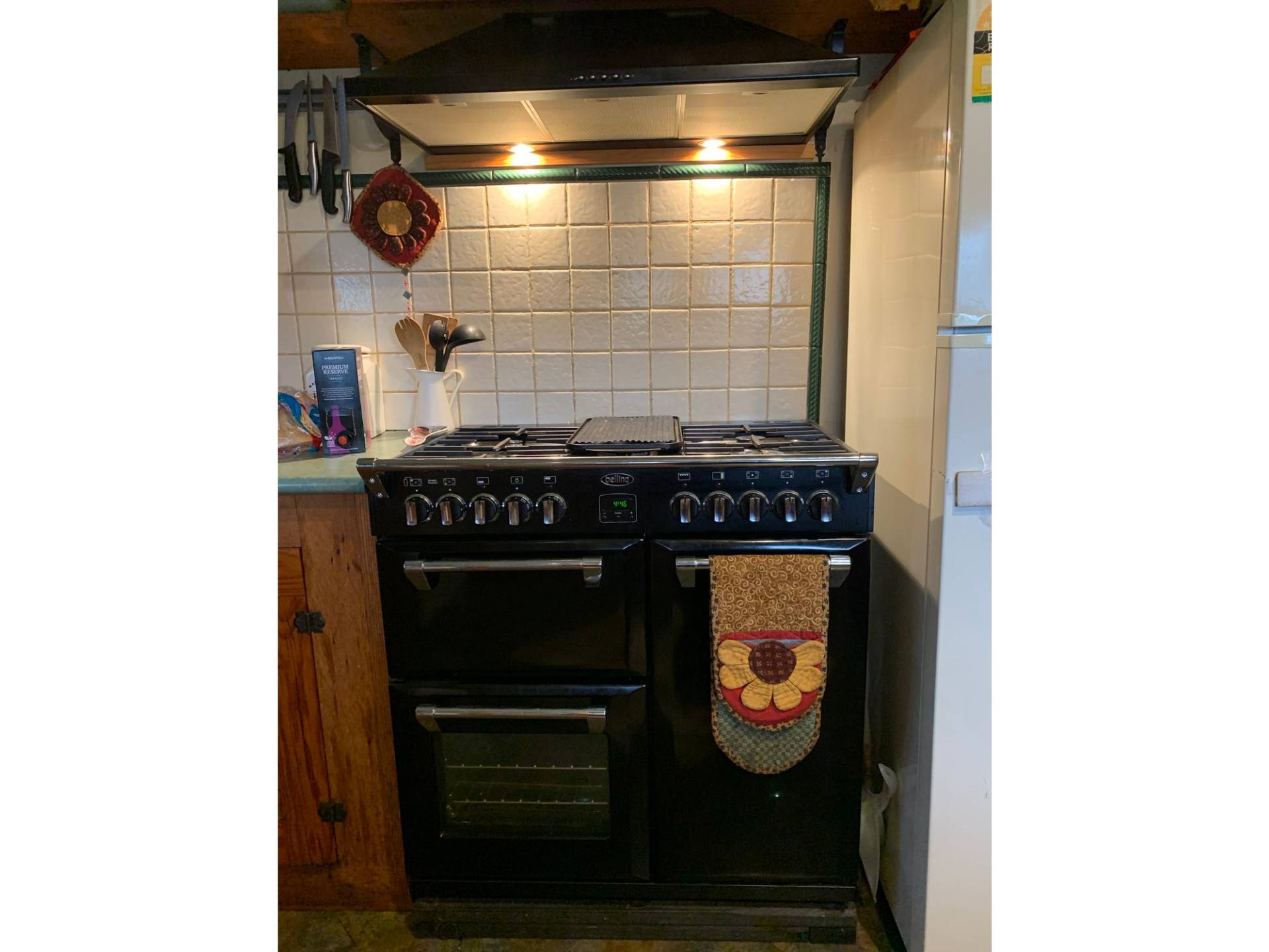 An open plan Oregon timber kitchen/dining/ lounge area equipped with modern appliances including a large belling gas cooker and a small wine cellar. A wood heater and R/C air-conditioner compliment this area - perfect for heating and cooling.