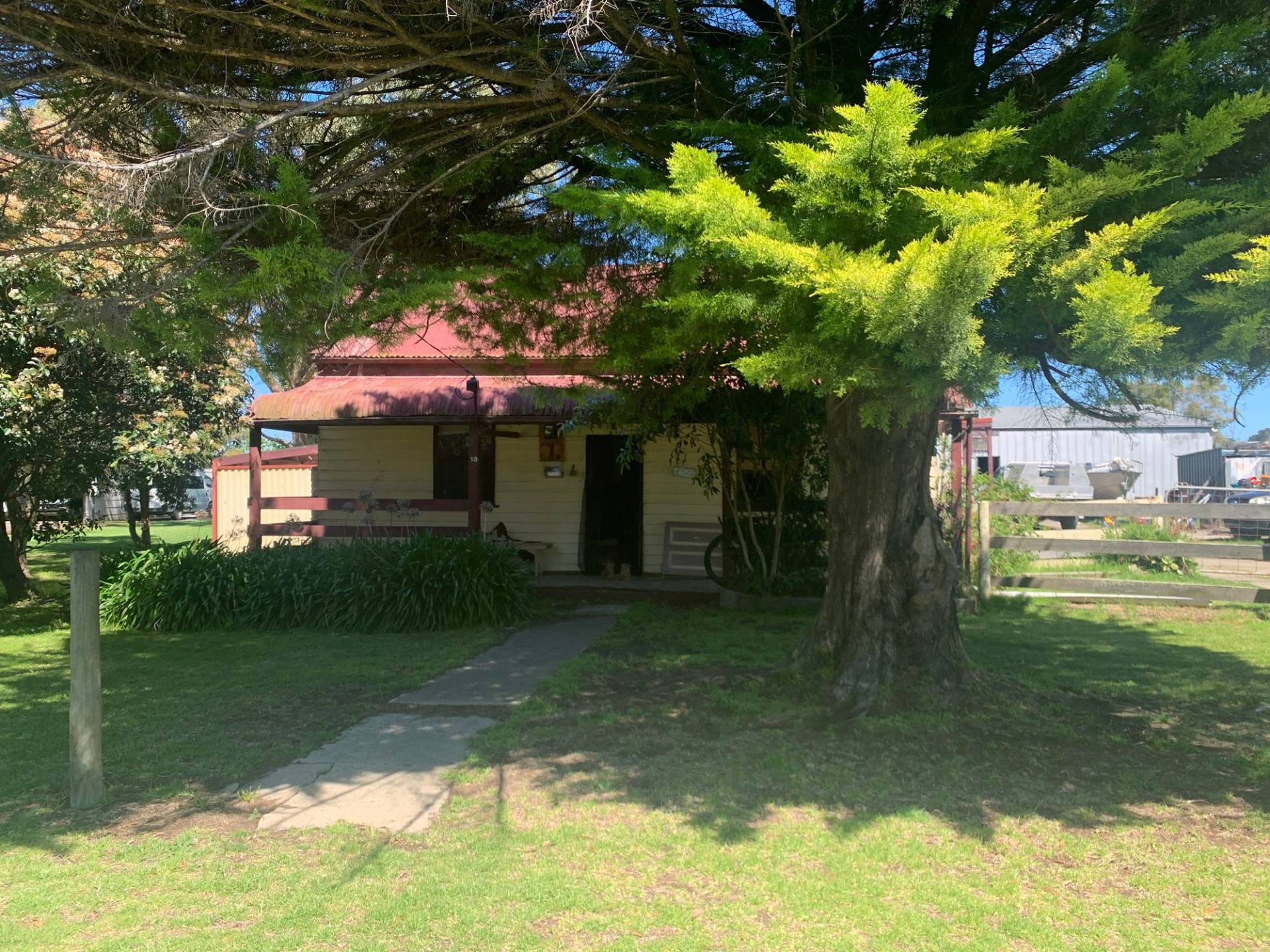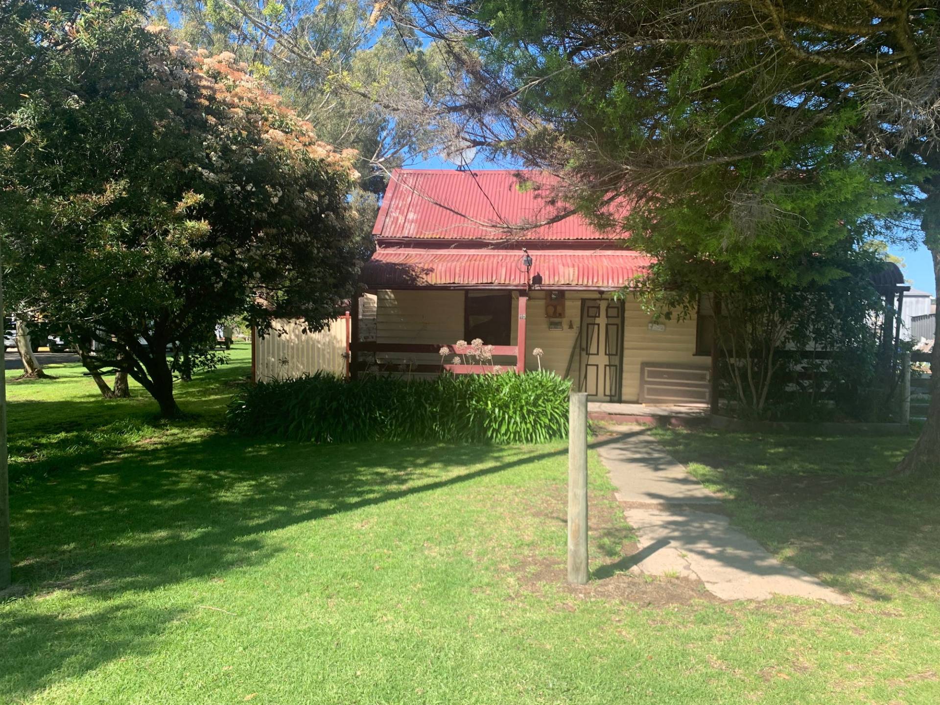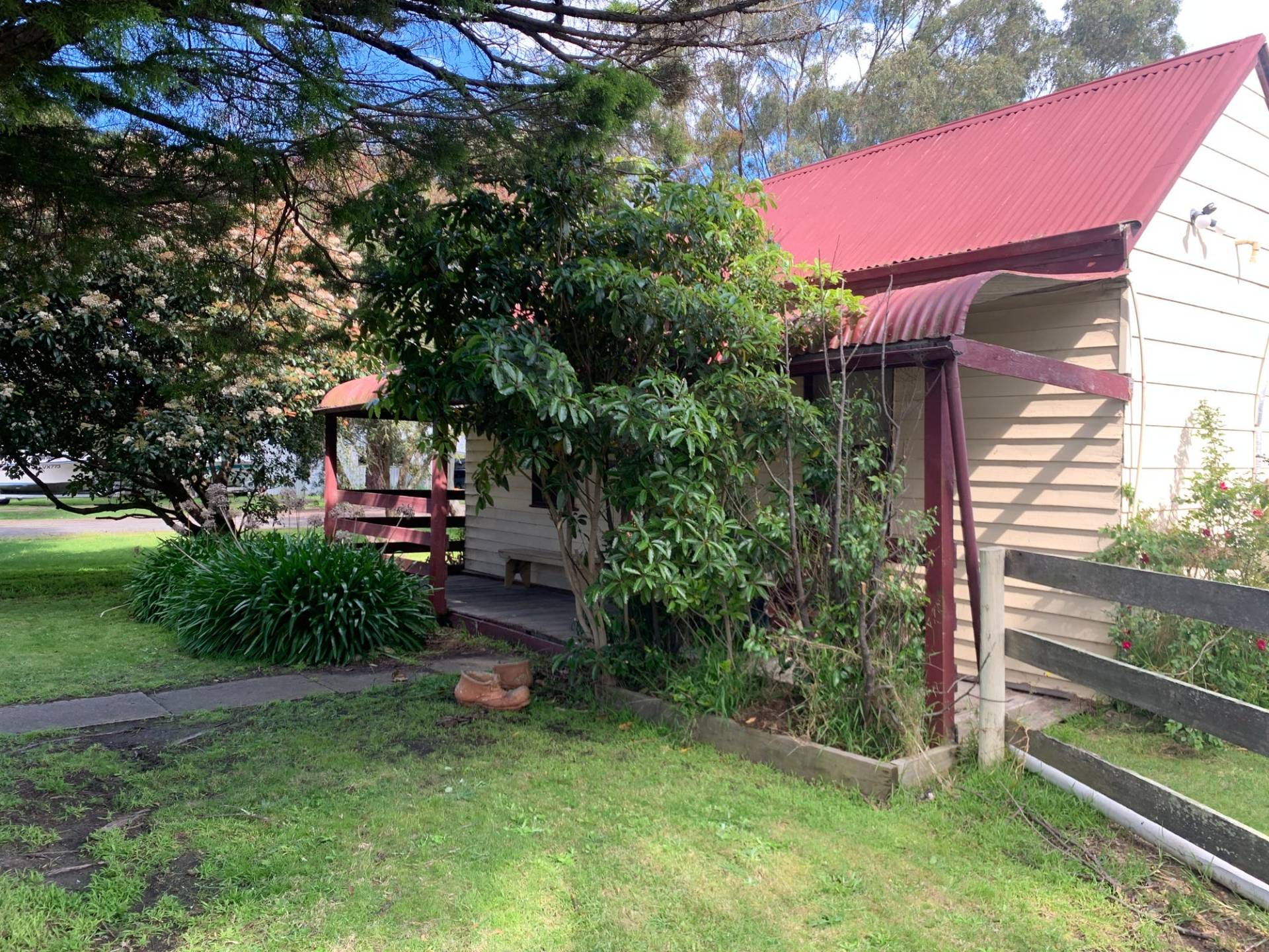 Historic Cottage facing NE that needs TLC on 8300m2. The home is 3 bedrooms and an office with an outdoor paved entertaining area. The front 4 rooms (3 bedrooms and loungeroom) need re stumping. Heavy rain causes a leak in the dining/ kitchen area. Two thirds of the interior walls are timber. The owners have been advised that the framing of the 15 X 9m shed with power (which includes an Art & Craft room) can be used to build a house or a new house can be built elsewhere. The block is a rectangle shape so that 2/3 of the block does not have neighbours. The acreage has a dam and a lovely treed backdrop.